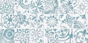 Seriia Lastoria imitująca beton o turkusowym zabarwieniu, składjąca się z gładkiej płytki bazowej oraz płytki dekoracyjnej o patchworkowym wzorze.