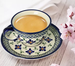 Filiżanka w klasycznym kształcie z dopasowanym spodkiem. Z pewnością stanie się wiernym towarzyszem chwili relaksu przy kawie lub zachwyci gości podczas serwowania herbaty na przyjęciach. Produkt wykonany z glinki ceramicznej, ręcznie formowany i dekorowany w Zakładach Ceramicznych w Bolesławcu. Symbol kształtu: GU 775 Dekoracja nr DU60 wchodzi w skład grupy unikatowej Ceramiki Bolesławieckiej.