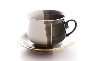 Filiżanka i spodek w kolorze biało czarnym. Komplet wykonany z użytkowej ceramiki szlachetnej. Wyprodukowany w Polsce przez fabrykę ceramiki szlachetnej w Mi...