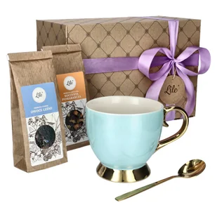 Filiżanka z łyżeczką i dwoma herbatami Cechy produktu: stylowa filiżanka w intensywnym, błękitnym kolorze z eleganckim, złotym zdobieniem na rączce i stópce ...