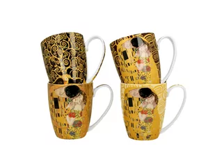 Komplet czterech kubków 350 ml gustav klimt wchodzący w skład serii art gallery, wykonany z porcelany new bone china, która charakteryzuje się naturalnym kremowo-białym kolorem z delikatnym połyskiem oraz wyjątkową wytrzymałością i trwałością, zachowując lekkość i finezję. linia wykonana z białej porcelany wewnątrz zdobionej reprodukcją obrazu "pocałunek" oraz "tree of life" gustava klimta. paleta ciepłych brązów oraz pastelowego ecru, w połączeniu z połyskującym złotem nadaje całości wyjątkowo eleganckiego charakteru oraz zaspakaja gusta nie tylko miłośnikom sztuki malarskiej. całość zapakowana w ozdobne pudełko dekorowane tym samym motywem to doskonały pomysł na niebanalny prezent urodzinowy zarówno dla kobiety i mężczyzny, a także podarunek dla szefa czy nauczyciela, również jako podziękowanie. obraz "pocałunek" z 1908 roku ręki gustava klimta zaliczany jest do nurtu secesji wiedeńskiej.