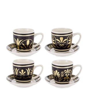 Podstawowe dane: Materiał: ceramika Kolor: czarny, biały, złoty Wymiary: filiżanka 7,5x7,5x11 ; talerzy Cechy produktu Efektowny i praktyczny upominek dla ka...