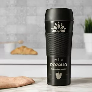 Czarny kubek termiczny z powłoką antypoślizgową i grawerem dla niej działkowca szefowej babci mamy na urodziny