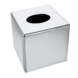 Kwadratowy pojemnik na chusteczki higieniczne o chromowym wykończeniu z połyskiem.