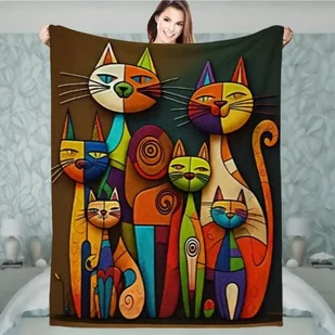 Duży ciepły koc kolorowy z kotami 150x200 cm miękki POP ART kocia rodzina