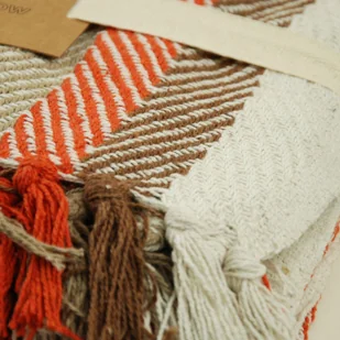 KOC pled 130x160 frędzle narzuta BOHO pasy rudy gruby ścieg