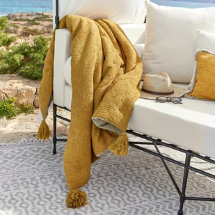 Ten wyjątkowo dekoracyjny pled nie tylko emanuje dobrym nastrojem dzięki swojemu słonecznemu odcieniowi, ale jest również przytulnie miękki. Zapewnia to wysoka zawartość bawełny. Piękne frędzle dodają radosną nutę z odrobiną stylu boho. Dzięki temu na balkonie, na pikniku w parku i oczywiście w domu na sofie lub łóżku zapanuje przytulna atmosfera ze świetnym akcentem dekoracyjnym. Otul się rozgrzewającym, lekkim i delikatnie strukturalnym materiałem i ciesz się cudownie relaksującą przerwą w dowolnym momencie.