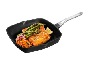 Wzór na patelni zapewnia wspaniałe ślady grillowania na mięsie i rybach. Z dwoma wylewkami. Kompatybilna ze wszystkimi płytami grzewczymi i nadaje się również do użytku w piekarniku w temperaturze maks. 230 stopni. Materiał: odlew aluminiowy i stal nierdzewna.