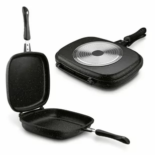 - patelnia dwustronna aluminiowa, odlewana, - pokryta trzywarstwową powłoką non-stick marble, -PFOA free, - dwie opcje do wyboru- dno gładkie lub stylizowane na ruszt, - uchwyt bakelitowy z wbudowanym magnesem, - silikonowa uszczelka, - odpowietrznik umieszczony w rancie, - wymiary korpusu: