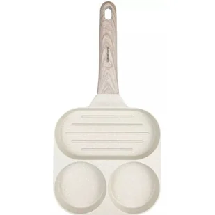 Podział patelni na 3 osobne sekcje umożliwia równoczesne smażenie różnych składników, takich jak jajka, bekon, warzywa czy kiełbaski, bez mieszania się smaków i zapachów. Każda sekcja ma odpowiednią wielkość, dostosowaną do różnych rodzajów jedzenia – mniejsze miejsca sprawdzą się idealnie na jajka, podczas gdy większe pozwolą na podsmażenie warzyw czy mięs. Większa sekcja ma chcarakterystyczne dla patelni grillowych żebrowania co jest szczególnie przydatne przy smażeniu kiełbasek czy plastrów warzyw jak np. cukinia.