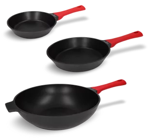 Zestaw patelni Obsidian z odlewanego aluminium, z innowacyjną, nieprzywierającą powłoką Greblon non-stick firmy WEILBURGER oraz pokrywek.
