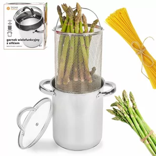Wysoki i wąski garnek z sitkiem Tadar pozwala perfekcyjnie przygotować spaghetti czy szparagi, dzięki temu że zawartość będzie całkowicie zanurzona w wodzie.