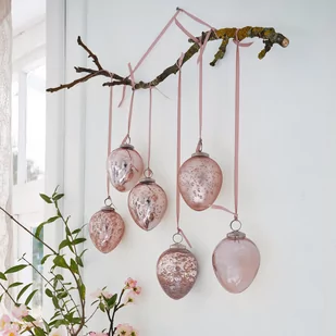 Jajka z dmuchanego szkła z niepowtarzalną strukturą powierzchni. W czarujących pastelowych odcieniach z subtelnym metalicznym połyskiem. Do dekoracji gałązek lub do ułożenia na tacach i w miskach. Twoja wyobraźnia nie zna granic, jeśli chodzi o dekoracje, prawda? Zawieś te delikatne, ręcznie dmuchane szklane jajka na suchych gałązkach lub umieść je na talerzach, tacach lub w szklanych misach. Gdziekolwiek się pojawią, będą błyszczeć swoim niepowtarzalnym kolorem.
