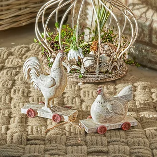 Delikatne ręczne malowanie. Uroczy, słodki duet z żywicy polimerowej. Rustykalny urok. Ten wspaniały kogut i piękna kura tworzą przyjazną parę. Wykonano je z dbałością o szczegóły – wyczarowują w Twoim domu atmosferę idyllicznego gospodarstwa wiejskiego.