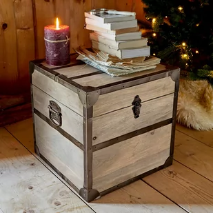 Dodatek o historycznym uroku – można przechowywać w nim cenne przedmioty. Ale oczywiście służy również do przechowywania wielu małych akcesoriów i drobiazgów przydatnych w codziennym życiu: od poduszek po miski. A może schowasz w niej książki lub papier pakowy z nożyczkami i ozdobnymi wstążkami? Tutaj zmieści się wszystko! A jeśli zechcesz, skrzynia ta może stać się również doskonałym stolikiem pomocniczym.