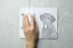 Curly Coated Retriever - podkładka pod myszkę z nadrukiem, personalizowana podkładka z psem, wyjątkowy gadżet dla pracownika biurowego marki Art-Dog Przedstawiamy wyjątkową podkładkę pod myszkę z nadrukiem przedstawiającym psy, koty oraz konie. Miękka podkładka poprawia komfort pracy przy komputerze. Jej poliestrowy wierzch jest gładki, zapewnia łagodny i płynny ślizg myszy, natomiast spód ze spienionej gumy zapobiega przesuwaniu się podkładki po blacie biurka. Nasze podkładki można w pełni spersonalizować: możemy zmienić zdjęcie, nazwę rasy, a także cały napis.