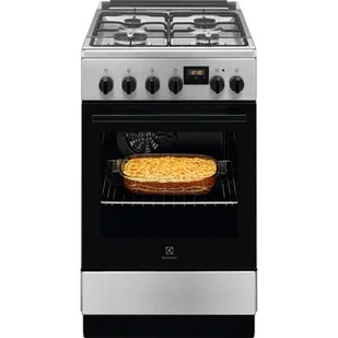 Kuchnia gazowo-elektryczna z piekarnikiem z funkcją Multilevel, opcją opóźnienia startu i automatyczną zapalarką. pojemność piekarnika wynosi 54 l i posiada on 4 poziomy pieczenia. Zakres temperatur grzania piekarnika wynosi 50°C - 250°C.