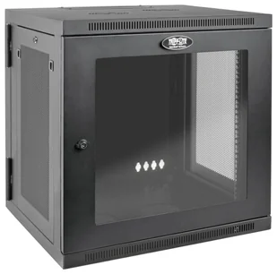 Regulowane szyny rack z kwadratowymi otworami montażowymi mieszczą do 12U standardowego sprzętu 19". Maksymalne obciążenie wynosi 91 kg. Solidny zawias między szafą a naścienną płytą montażową umożliwia odchylenie szafy od ściany w celu łatwego dostępu do sprzętu i okablowania. Górne i dolne panele zawierają wygodne przepusty do prowadzenia kabli. Eaton TrippLite SRW12USDPG – kluczowe informacje: