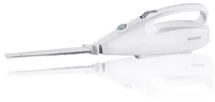 Nóż elektryczny Severin EM 3965 100W Biało-Szary Doskonale wykonany Nóż elektryczny SEVERIN EM 3965 pozwala na łatwe i wygodne krojenie pieczywa, warzyw, wędlin, mrożonek, a nawet porcji mięsa z kością. Dzięki temu urządzeniu możesz wyraźnie skrócić czas przygotowywania posiłków, a serwowane plastry mięsa, sera czy warzyw będą równe i estetyczne. Udogodnienia, takie jak przycisk zwalniający ostrze i osłona na palce, w znaczący sposób ułatwiają pracę. Dołączony do urządzenia zestaw ostrzy można bez problemu myć w zmywarce.