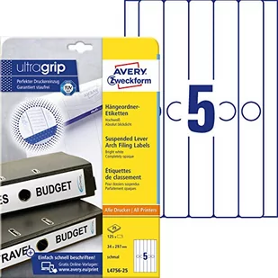 AVERY Zweckform L4756-25 Wiszące etykiety na akta (z ultragripem, 34 x 297 mm na DIN A4, nieprzezroczyste, samoprzylepne, etykiety na akta do zadrukowania, 125 etykiet na 25 arkuszach) białyZgłoszona do opatentowania technologia ultragrip - trójwymiarowy profil na tylnej stronie arkusza etykiet zapewnia optymalne podawanie do drukarki i prowadzenie arkuszaNieprzezroczysty materiał pokrywa stare etykiety i etykiety Optymalne pokrycie starych etykiet; niezawodna trwała przyczepnośćJasnobiałe etykiety zapewniające pierwszorzędny i profesjonalny wygląd. Odpowiednie do folderów Leitz, Elba, Esselte, Mehle, Herlitz, Bene i innychGwarantowana przepustowość drukarki bez zacięć i pierwszorzędny obraz wydrukuPuste etykiety samoprzylepne do samodzielnego zaprojektowania i wydrukowania dzięki m szablonom online od AVERY Zweckform. Link do nich znajduje się na opakowaniu produktu lub na stronie internetowej AVERY ZweckformOpisy produktówRozmiar: Format 34 x 297 mmCzy chciałbyś zorganizować swój system archiwizacji w biurze i w domu w sposób Indywidualnie zadrukowywane recyklingowe etykiety na teczki od AVERY Zweckform oferują to rozwiązanieNieprzezroczyste, przyjazne dla środowiska etykiety na teczki od AVERY Zweckform - dostępne w wielu formatach, kolorach i wzorach - nadają teczkom profesjonalny wygląd. Dostosuj swoje etykiety online i ponownie wykorzystaj stare foldery - oszczędzając czas i pieniądze oraz chroniąc środowisko.