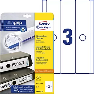 AVERY Zweckform L4757-25 Wiszące etykiety na akta (z ultragripem, 63 x 297 mm na DIN A4, nieprzezroczyste, samoprzylepne, etykiety na akta do zadrukowania, 75 sztuk na 25 arkuszach) białyZgłoszona do opatentowania technologia ultragrip - trójwymiarowy profil na tylnej stronie arkusza etykiet zapewnia optymalne podawanie do drukarki i prowadzenie arkuszaNieprzezroczysty materiał pokrywa stare etykiety i etykiety Optymalne pokrycie starych etykiet; niezawodna trwała przyczepnośćJasne, białe etykiety zapewniające profesjonalny wygląd pierwszej klasy. Do szerokich teczek zawieszkowych (63x297 mm), odpowiednich m. in. dla Leitz i ElbaGwarantowana przepustowość drukarki bez zacięć dla drukarek laserowych potwierdzona przez SÜDPuste etykiety samoprzylepne do samodzielnego zaprojektowania i wydrukowania dzięki m szablonom online od AVERY Zweckform. Link do nich znajduje się na opakowaniu produktu lub na stronie internetowej AVERY ZweckformOpisy produktówRozmiar: Format 63 x 297 mmCzy chciałbyś zorganizować swój system archiwizacji w biurze i w domu w sposób Indywidualnie zadrukowywane etykiety na segregatory z recyklingu od AVERY Zweckform oferują Ci rozwiązanieNieprzezroczyste, przyjazne dla środowiska etykiety na teczki od AVERY Zweckform - dostępne w wielu formatach, kolorach i wzorach - nadają teczkom profesjonalny wygląd.