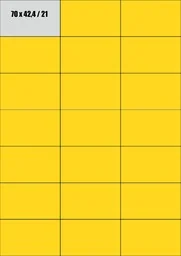 ICPC A4 ŻÓŁTE Etykiety samoprzylepne 70x42 ŻÓŁTE Format: A4 Ilość: 100 arkuszy 21 naklejek na arkuszu Informacje dodatkowe: Nadają się do wszystkich urządzeń drukujących - drukarek atramentowych, drukarek laserowych, kopiarek. Podłoże papierowe, matowe. Kolor żółty (003) - w rzeczywistości kolor etykiet może nieznacznie różnić się od koloru w ofercie.