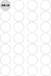 LAMBDA L-DF/40 / L DFI40 Etykiety samoprzylepne FI 40 MM 28 etykiet w kształcie koła na jednym arkuszu Format: A4 Ilość: 100 arkuszy Informacje dodatkowe: Nadają się do wszystkich urządzeń drukujących - drukarek atramentowych, drukarek laserowych, kopiarek. Podłoże papierowe, matowe, białe. Pakowane po 100 arkuszy A4.