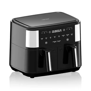 Czas pracy można regulować w zakresie od 0 do 60 minut. Szeroki zakres regulacji temperatury od 50 do 200°C umożliwia przygotowanie wielu różnych dań. Dzięki frytkownicy skrócisz czas przygotowywania posiłków o ponad połowę! Dwie oddzielne strefy gotowania 2 x szybsze gotowanie Taste 90 wyposażony jest w dwie oddzielne strefy gotowania, które mogą pracować niezależnie od siebie. Dzięki temu przygotujesz dwa różne dania w jednym czasie! Frytkownica beztłuszczowa Taste 90 umożliwia gotowanie 2 różnych potraw przy wykorzystaniu innych funkcji, temperatur lub czasów gotowania – dzięki funkcji Sync Finish, obie strefy zakończą pracę w tym samym momencie. 2 kosze o łącznej pojemności 9 L pozwalają na przygotowanie obiadu dla dużej rodziny lub gości.