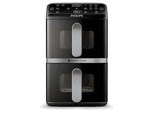 Frytkownica beztłuszczowa Air fryer Philips Ovi Stacked Dual Basket Na461/00 Czarno-srebrny Philips Airfryer Ovi Na461/00 to beztłuszczowa frytkownica o pojemności 10 litrów, wyposażona w dwa niezależne kosze ułożone pionowo. Pozwala przygotować dwa pełne dania jednocześnie, oszczędzając miejsce na blacie. Dzięki technologii Rapid Air potrawy są równomiernie opiekane, chrupiące na zewnątrz i delikatne w środku.