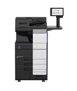 Wyposażenie: podajnik oryginałów dual scan DF, duplex (auto dwustronne drukowanie), 2 uniwersalne szuflady na papier po 500 arkuszy + 2 kasety A4 na papier po 1000 oraz 1500 arkuszy + podajnik ręczny, SSD 256GB Gigabit karta sieciowa.