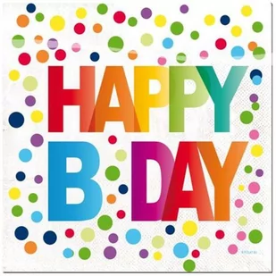 Serwetki papierowe z nadrukowanymi kolorowymi kropkami i napisem Happy Birthday! Idealne jako element urodzinowej dekoracji dla każdego.