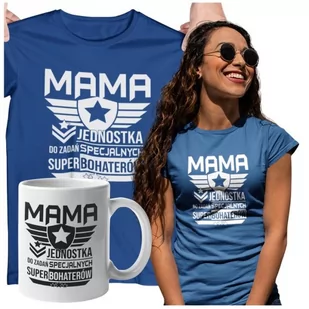 Koszulka dla Mamy na Dzień Mamy zestaw z kubkiem i nadrukiem Mama jednostka do zadań specjalnych super bohaterów kolor granatowy