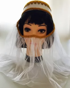Wspaniały gustowny kapelusz Arabskiej Damy. Jeśli kompletujesz kostium Arabki to obowiązkowy element tego stroju. Czapka w kolorze białym zdobiony złotą aplikacją wokól wycięcia na oczy. Całość prezentuję się niezwykle profesjonalnie i sprawia, że czapka wygląda jakby należał do dziewczyny z haremu.