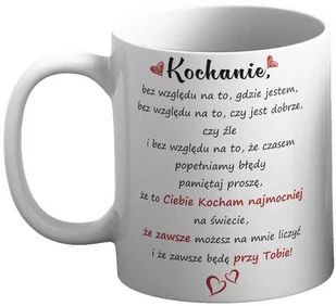 ". . . bez względu na to, czy jest dobrze czy źle i bez względu na to, że czasem popełniamy błędy, pamiętaj proszę. . . " Kubek z okazji Walentynek na prezent Kubek z nadrukiem jako prezent na Walentynki, dzień Kobiet, Mikołaja, Gwiazdkę, urodziny, imieniny oraz pod Choinkę. SPECYFIKACJA KUBKA: Idealny na oryginalny prezent, zapakowany białe estetyczne pudełeczko z okienkiem. Nadruk na kubku wykonany jest trwałą metodą sublimacyjną.