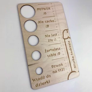 Imię na miarce może być dowolne. Specyfikacja: - Materiał: sklejka drewniana 3mm - Wykonanie: cięcie laserowe oraz grawer laserowy - Wymiary: 16cm x 28cm
