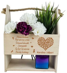 sznurek jutowy - Znakowanie: grawer (z jednej strony) - Wymiary: 23. 5cm x 16cm x 29cm - Wysoka jakość wykonania - Produkt Polski Kwiaty i butelka przedstawione na zdjęciach są elementem dekoracyjnym i nie wchodzą w skład nosidełka. Produkt personalizowany wykonywany na zamówienie.