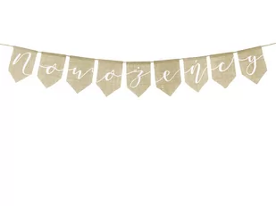 Piękny baner na ślub wykonany z juty. Baner posiada biały napis NOWOŻEŃCY. Materiał z którego jest wykonany warunkuje bardzo solidny i nietuzinkowy wygląd, niewątpliwie zaskoczy on Twoich gości lecz i Ciebie samego. Wymiary to ok 23 cm wysokości i ok 155 cm długości.