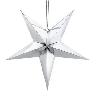Oryginalna dekoracja w formie pięcioramiennej GWIAZDY wykonanej ze sztywnego LUSTRZANEGO papieru w kolorze SREBRNYM. Gwiazda jest z serii DIY - Do it yourself - czyli do samodzielnego złożenia. W zestawie znajduje się również SREBRNY sznurek.