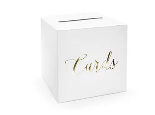 Pudełko na telegramy to wspaniały dodatek ślubny. Wręczając takie pudełko świadkowi rozwiązujemy niezręczny problem z telegramami, które zazwyczaj są cenne i nie ma gdzie ich odkładać podczas wręczania życzeń Młodej Parze. Pudełko z kolekcji CARDS wykonane z białego papieru ze złotym metalizowanym napisem.