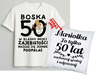 Personalizowany zestaw prezentowy na 50 urodziny dla kobiety - KOSZULKA ORAZ poduszka z imieniem na 50 urodziny W skład zestawy wchodzą koszulka na 50 urodziny oraz dodatkowo poduszka z fajnym nadrukiem, Koszulka wykonana z bawełny. Poduszka natomiast ma wymiary około 40 cm na 40 cm. Jets to kompletna poduszka z wypełnieniem Poszewka, zapinana na zamek. T-shirt damski o modnym kroju. Rękawki proste.