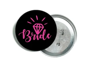 Kotylion na agrafce ze wzorem na wieczór panieński. Przypinka czarna z różowym napisem Bride i diamentem. Wielkość: 56 mm. Opakowanie: 1 szt.