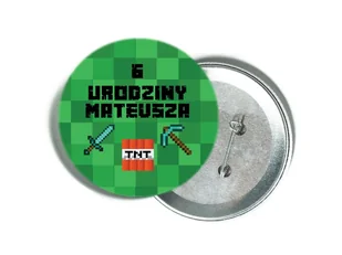 Plakietka na agrafce ze wzorem Piksele. Przypinka personalizowana, w notatce do zamówienia proszę podać imię solenizanta i wiek. Wielkość: 56 mm.
