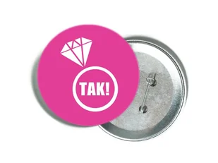 Przypinka różowa z białym napisem TAK! i pierścionkiem