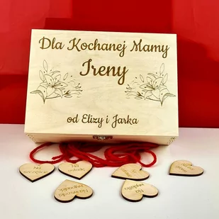 drewno - wymiary: 21,5 cm x 16 cm x 6,8 cm - wymiar jednej przegródki 6,5 cm x 7 cm - wysokość przegródki 6 cm - serduszka wykonane z drewnianej sklejki - metoda znakowania: grawer - produkt Polski - metalowe zapięcie w kolorze złotym Dodatki przedstawione na zdjęciach są elementem dekoracyjnym i nie podlegają sprzedaży. Produkt personalizowany, wykonywany pod zamówienie.