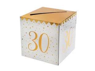 Pudełko urodzinowe na KOPERTY i KARTKI Z ŻYCZENIAMI to unikatowy i oryginalny dodatek na Twoje urodzinowe przyjęcie. Stawiając takie pudełko w "honorowym" miejscu rozwiązujemy niezręczny problem z odkładaniem/trzymaniem ich w ręce podczas składania życzeń, Koperty zazwyczaj są cenne i nie ma gdzie ich odkładać, dlatego warto zaopatrzyć się w przeznaczone do tego pudełko. Produkt wykonany z kartonu w kolorze białym ze złotą metaliczną liczbą 30 - mówiącą o liczbie minionych wiosen.