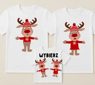 Świąteczny zestaw koszulek dla rodziny 2+1 – Renifery w czapkach zimowych Stwórz magiczny, rodzinny klimat świąt z uroczym zestawem koszulek dla całej rodziny! Każda koszulka ozdobiona jest wesołym reniferem w czerwonym sweterku i czapce zimowej — idealna propozycja na wspólne zdjęcia, świąteczne spotkania czy rodzinny prezent pod choinkę. Zestaw zawiera: koszulkę dla mamy z reniferem w czerwonej sukience, koszulkę dla taty z reniferem w sweterku, koszulkę dla dziecka z napisem WYBIERZ (możliwość wyboru renifera chłopca lub dziewczynki). Dlaczego warto: idealny komplet na świąteczne sesje zdjęciowe, miękki, oddychający materiał (100% bawełna), nadruk wysokiej jakości odporny na pranie, możliwość dopasowania rozmiarów dla każdego członka rodziny.