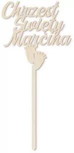 Specyfikacja: Materiał: sklejka drewniana 3 mm Wymiary napisu: 14 x 14 cm Wysokość toppera z patyczkiem: ok 26 cm Wykonanie: cięcie laserowe Na czas transportu produkt owinięty jest w tekturkę oraz folię bąbelkową Produkt dodatkowo można ozdobić własnym akcentem np.