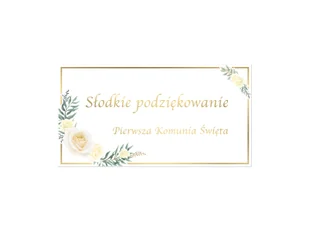 Samoprzylepne etykiety na pudełka na ciasto na I Komunię Świętą. Wielkość: 8,5 cm x 4,5 cm. Opakowanie: 30 szt.