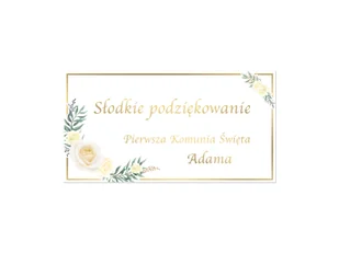 Samoprzylepne etykiety personalizowane na pudełka na ciasto na I Komunię Świętą. Wielkość: 8,5 cm x 4,5 cm. Opakowanie: 30 szt. Imię dziecka w formie odmienionej proszę umieścić w wiadomości do zamówienia.