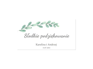 Samoprzylepne etykiety personalizowane z eukaliptusem na pudełka na ciasto. Wymiary: 8,5 cm x 4,5 cm. Opakowanie: 30 szt. Należy podać imiona pary młodej, datę oraz miejsce wesela. Tekst do etykiet proszę umieścić w wiadomości do zamówienia.